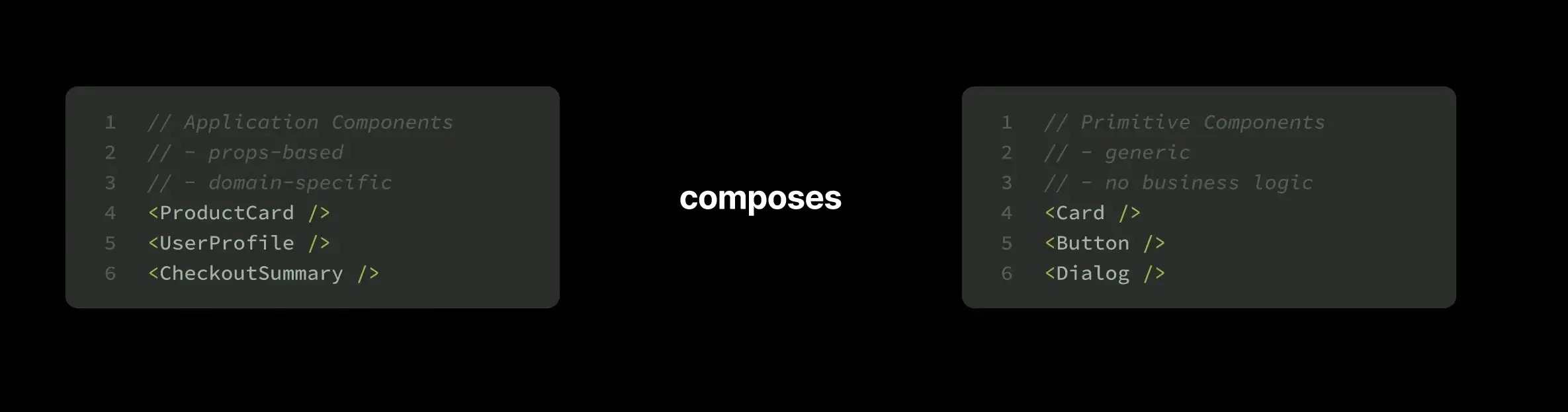 ❌ "I've predicted every use case, configure via props" Components should manage the things users can't easily implement themselves: focus management, keyboard interactions, accessibility concerns. But they shouldn't dictate visual layout or the specific arrangement of their children. A Dialog managing focus and escape key handling is providing value. A Dialog deciding that action buttons must always appear right-aligned is being prescriptive about concerns that should live in the consuming code.